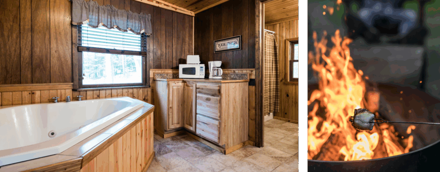 As the only Heritage Cabin with a jetted tub, it’s perfect for soaking away the day’s adventures in comfort. The compact kitchen has a microwave, toaster, mini fridge, and coffee maker for simple meals or morning coffee.